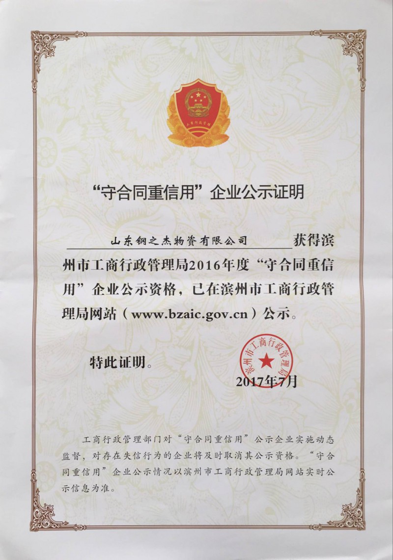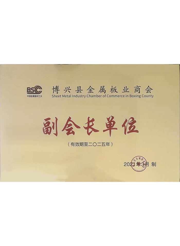 公司自成立以來(lái)分別榮獲“守合同重信用企業(yè)”、“消費者滿(mǎn)意單位”、“安全生產(chǎn)先進(jìn)企業(yè)”、“科學(xué)發(fā)展綜合考核明星企業(yè)”、“AAA級信用企業(yè)”、“博興縣金屬板業(yè)商會(huì )副會(huì )長(cháng)單位”、“村企共建助力鄉村振興貢獻獎”等榮譽(yù)稱(chēng)號。