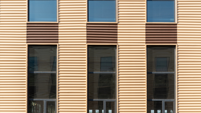項目墻面系統業(yè)主精心挑選了赭黃+蘇黃兩種色彩搭配,面板選用上海寶鋼高鋅鋁鎂PE涂層,配以780型大波紋橫鋪安裝方式,輔以藍色玻璃幕墻裝飾,使整個(gè)墻面系統線(xiàn)條流暢,實(shí)現光影交錯的分層效果,美觀(guān)大方,堅固耐用,歷久彌新。
